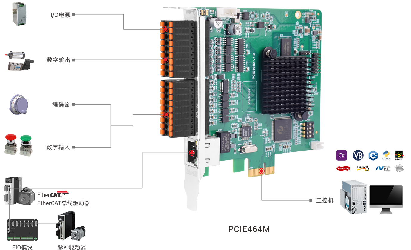 PCIE464M运动控制卡适合于多轴点位运动、插补运动、轨迹规划、手轮控制、编码器位置检测、IO控制、位置锁存等功能的应用。